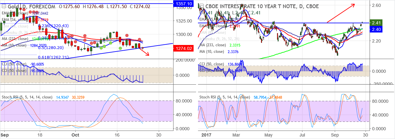 • Gold -0.21% hits fresh 2 week –low after showing a minor recovery till $1283.50 yesterday on account of strong US 10 –year yields and...