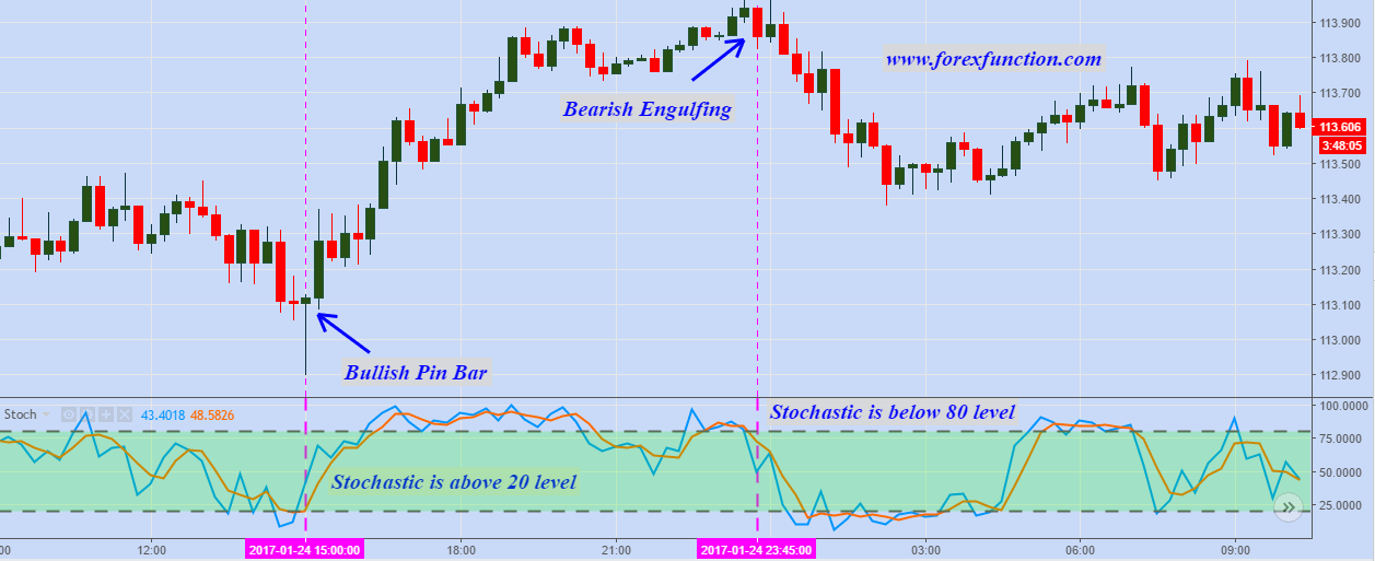 In the above USDJPY M15 chart, stochastic moves from oversold area and at the same time, pin bar formed which indicates buy signal in this strategy. Since then market started moving in upward direction. On sell example, bearish engulfing was formed and stochastic also started downfall.
